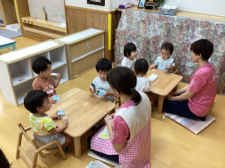 お友達や担当保育教諭と嬉しいおやつタイムです😋